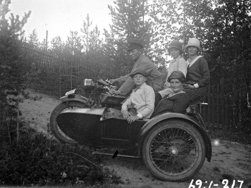 familj, motorcykel, sidovagn, grusväg, staket