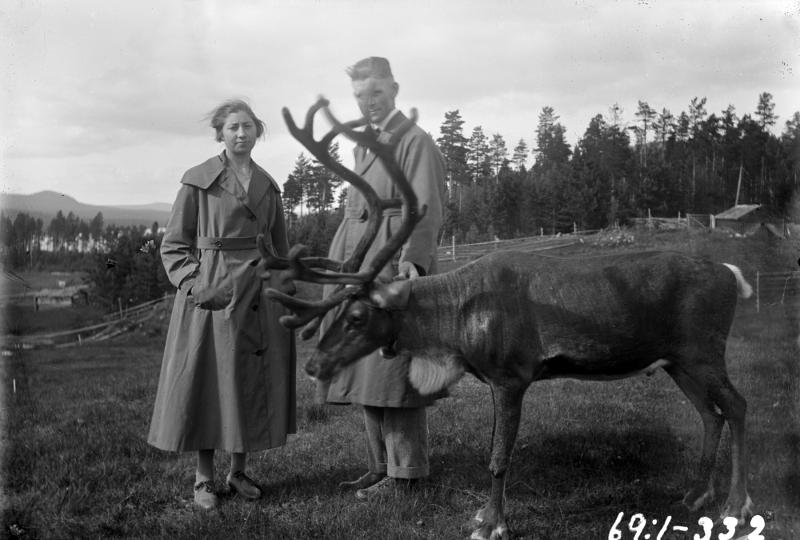 man och kvinna med ren; Om fotografen Anders Jakobsson berättar hans dotter Elin Jakobsson i boken "Porsi i ord och bild" från 1992.Hon berättar att fadern var fotograf. Den första i "södra delen av socken". Wästfelt från Jokkmokk var fotograf i Norra delen. Anders började nog fotografera 1899-1901. Glasplåtar. Det fotograferades till vigslar, barndop, begravningar, beväringsfoton, familjefoton, ja det mesta som hände i bygden. Enligt boken dog Anders Jakobsson föräldrar och barnen utackorderades då. Den äldste sonen Anders Jakobsson kom till en bondgård ett par mil längre bort som heter Padjerim. Där fick han slita ont med så lite materiella förnödenheter som möjligt. Någon hästkarl var han nu inte, han hade desto mer håg för maskiner och dylikt. Den lille klena gossen sysslade med sina uppfinningar, till de äldre och kamraternas förundran. Han var ej lik de andra. Anders var medlem i Missionsvännerna i bygden. Han skänkte marken som Missionshuset byggdes på i Porsi. Anders Jakobsson sysslade med mycket, som hans kropp orkade med. Han var klockslagare, och lagade allt möjligt, han snickrade m.m. När han fyllt 50 år tog han körkort i Luleå. Han köpte den första bilen i Porsi, år 1923, tydligen en lastbil. Anders Jacobsson föddes år 1865 och dog år 1940.