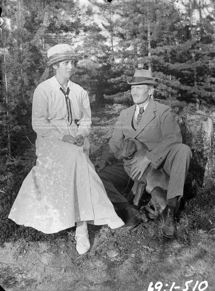 familjeporträtt, kvinna, man, jägmästare, hund, barrskog