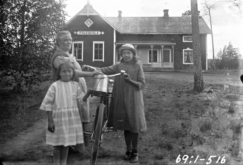 - kvinna och 2 st flickor framför skolan