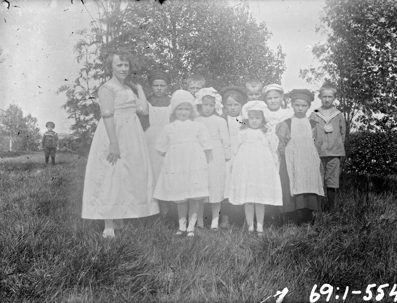 grupporträtt, barn, kvinna, ängsmark
