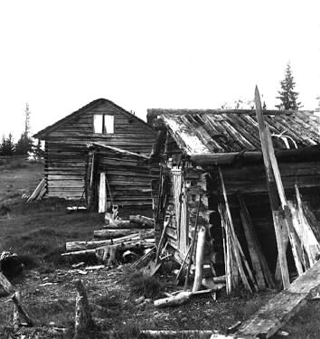 LA 1140. En del av Teilus gård. Vedboden i förgrunden med järvsax på taket. 9 B. Ladugård längst bort, dasset i mitten