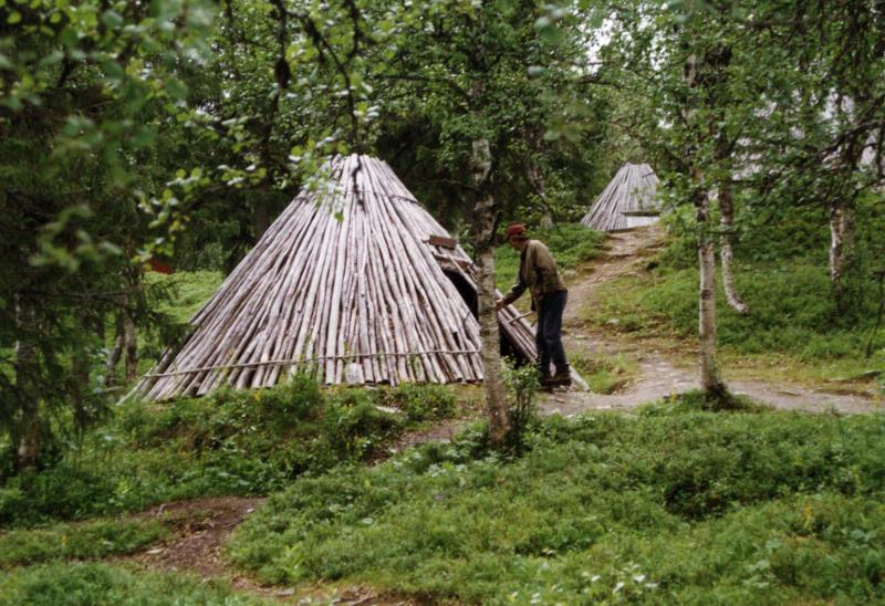 kåta av bågstångstyp med näver och ett yttre lager av bakved.