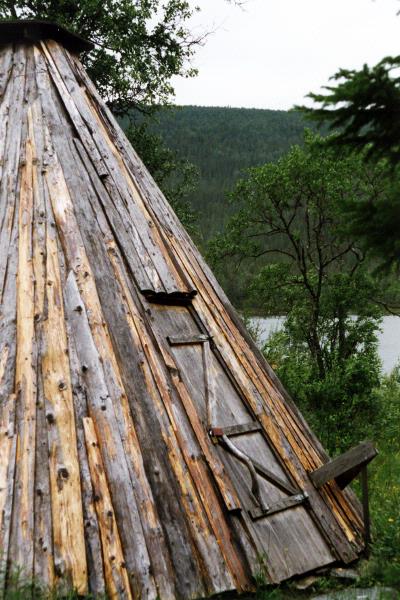 kåta av bågstångstyp med näver och ett yttre lager av bakved