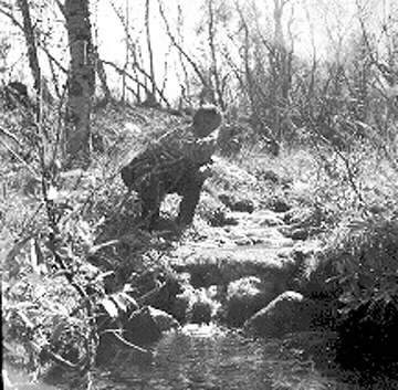 1997:17:00424:A :: skogsparti, bäck, man, fotograf, dryckeskärl