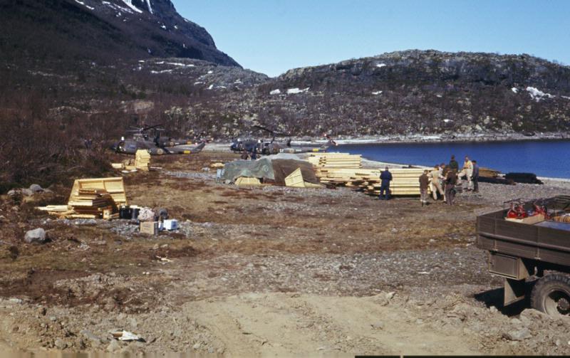 EdholB:00022:D :: fjällvärld, fjällsjö, helikopter, lastbil, byggnadsutrustning, virkesstapel, byggnadsarbetare