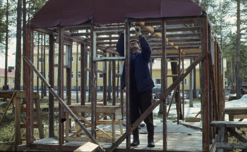 Tjågnorisstugan flyttad från Tjågnoris. Stugan är under uppbyggnad i Jokkmokk utanför Jokkmokks museum, november 1968.