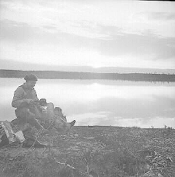 1997:17:01365:A :: sjö, strand, solnedgång, man, fotograf, kafferast