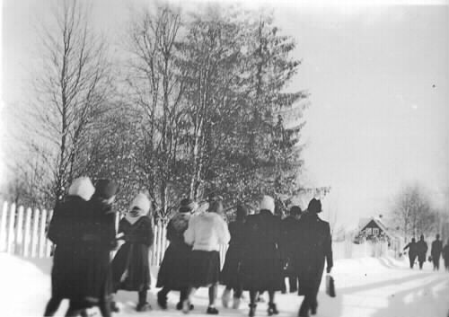 Samernas Folkhögskolas elever, vinterkursen 1943-1944, elever på väg, flickorna