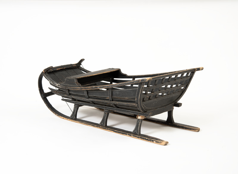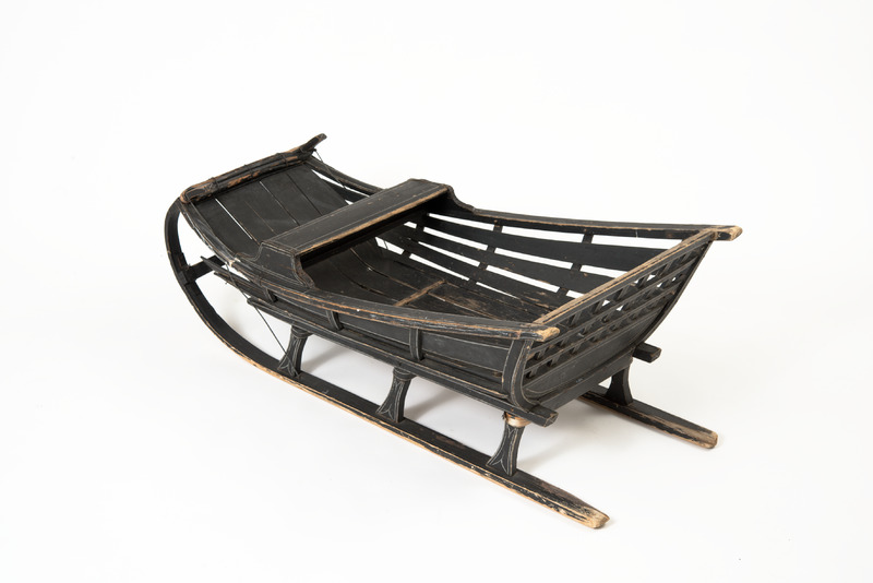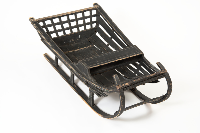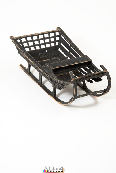 Risslan är svart med dekorationer av linjer målade med vit färg. Risslan är för barn och i gott skick. Baktstycket är fastspikat mot sidostyckena med järnspik, som rostat. Tvärslå fram surrad med järntråd. I övrigt av träplankor och snidade grenar/vidjor.