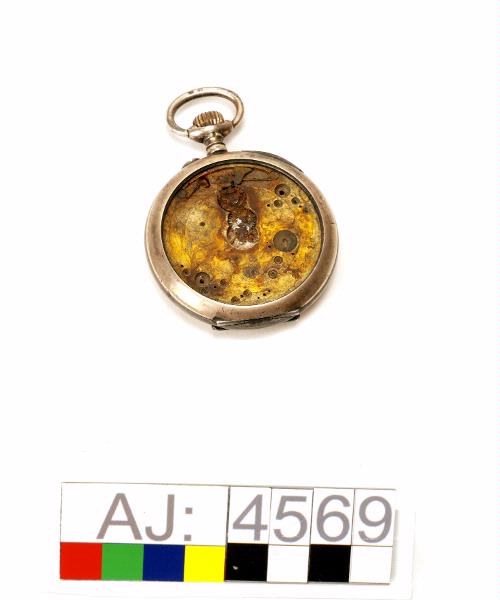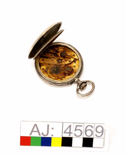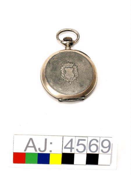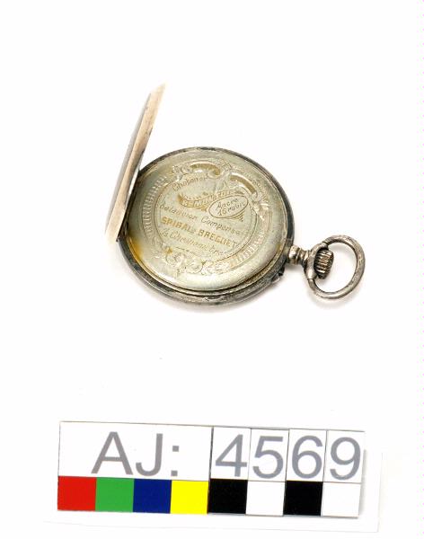 Fickur, öppningsbart. Bara själva klock-boetten finns kvar. Glas, visare och urtavla saknas.Klockans hjul syns och den har rostfläckar. Baksidan av klockan har ett lock i gångjärn. När man öppnar locket är text och dekorationsmönster inristat. Texten: Chatoner, Remontoir, Ancre 16 rubis, balancier Compense, SPIRAL BREGUET, 1/2 Chronometre. På locket insida är stämplar och ett nummer. Lockets utsida har ett mönster av en utsirad sköld. Högst upp en metallögla och uppdragningsskruv.