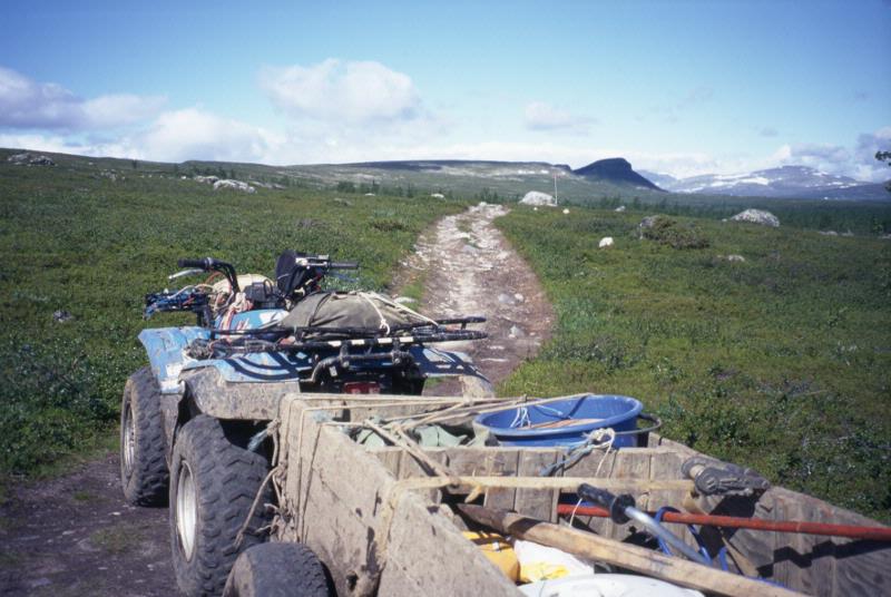 Modern teknik för frakt av förnödenheter i stället för härk och pulkor, fraktas från Sitoälvsbron till Tjåhke. Leden har skapats för fyrhjulingarna, det är ingen gammal flyttled. Bilden är tagen där Aktse Njunjes tar slut österut.