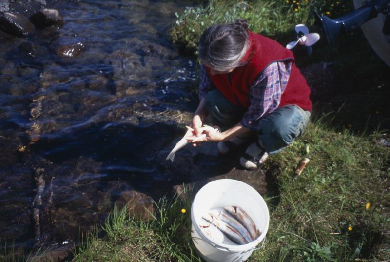 L:25:1999:1:0018 :: fiskrensning, kvinna, fjällnatur, sköljning, fisk, naturreservat, viste, sameviste, sommar