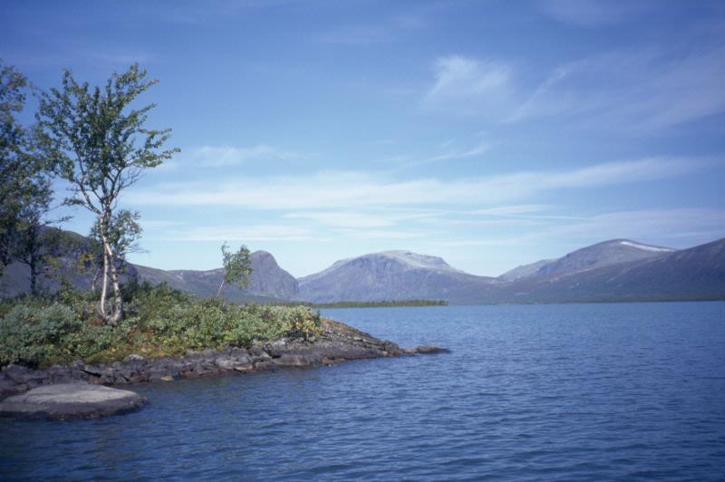 Bilden är tagen från fjällsjön Sijddojávrre och västerut mot en udde med björkar.