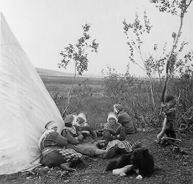 samernas Folkhögskola håller en folkbildningskurs för Lainiovuoma samerna. Kursen hålls i kåta i augusti 1951. Rektor håller kursen med några medhjälpare. Samebyns kvinnor vid kåtan