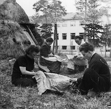 samernas Folkhögskola elever, fortsättningskurs 1952, skinnberedning. Eleverna bereder och skrapar skinn