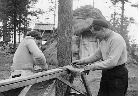 samernas Folkhögskola elever, fortsättningskurs 1952, skinnberedning. Eleverna bereder och skrapar skinn