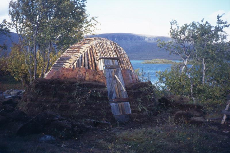 fjäll; fjällvärld; fjällnatur; naturreservat; höst; fjällsjö; kåta; torvkåta; rökkåta; torv; näver; plåt; byggnadskonstruktion; virke; björk