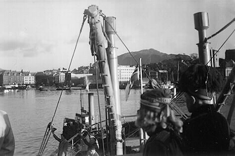 - samernas Folkhögskolas elever, vinterkursen 1947-1948. 3 maj, avresa från Bergen med båten Tordenskjöld till Trondheim. På båten som är på väg ut från hamnen