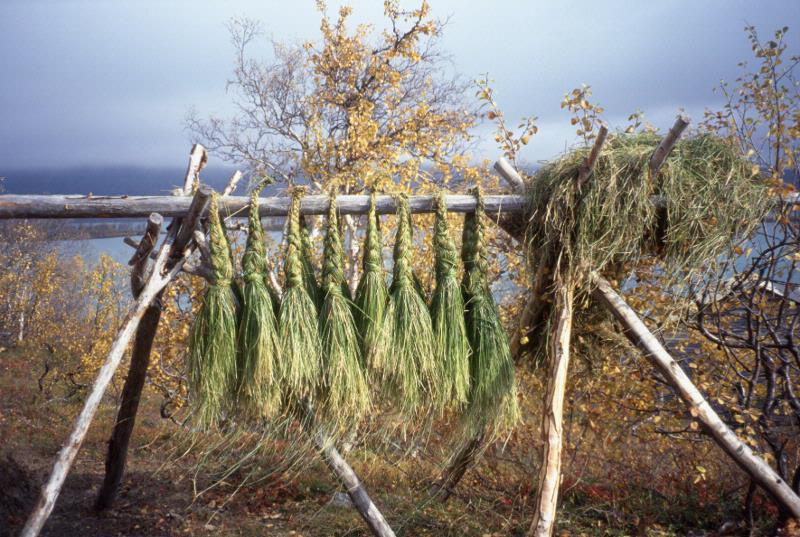 - Gámasjuojne - skohö - flätas i två flätor som kallas för bilggá för att sedan torkas. Av två färdigkammade knippen blir det en bilggá. Skohö som hänger på torki ett par dagar. Överblivet hö av det bättre slaget sätts också på tork.