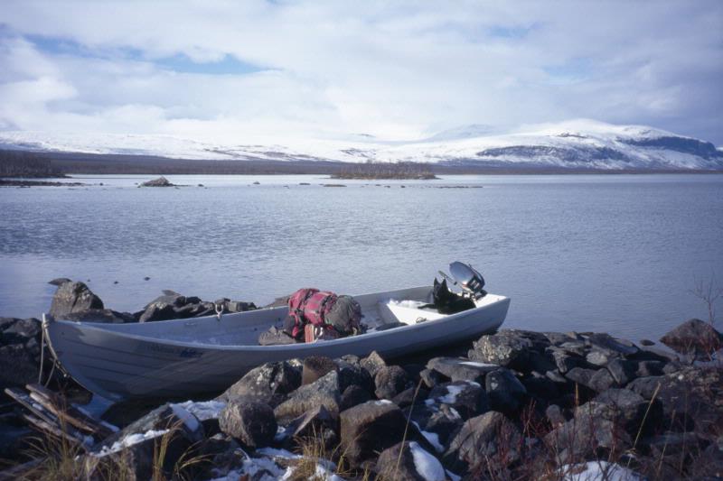 En båt som är rustad för höstfiske. Snö på fjällen i bakgrunden.