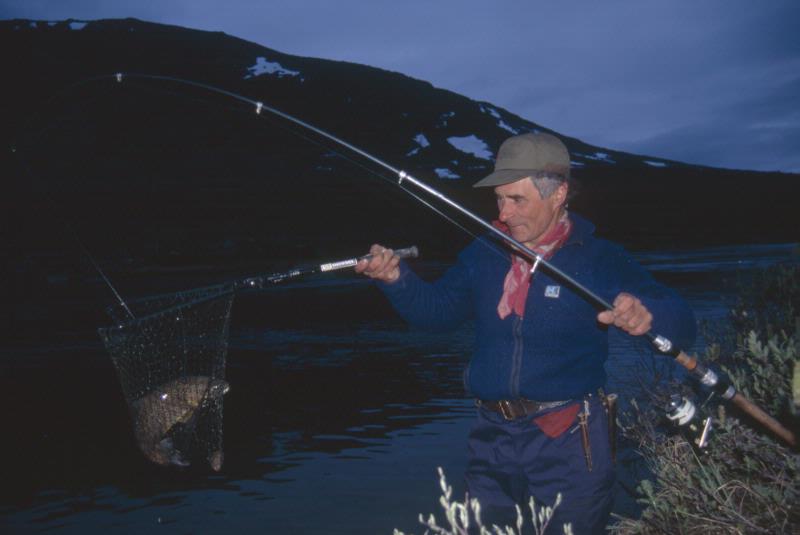- Fritidsfiske. Snöfläckat fjäll i bakgrunden. En laxöring blir inhåvad, fångad med hjälp av kastspö. Bilden är tagen under en fisketur till övre Sijddoädno.