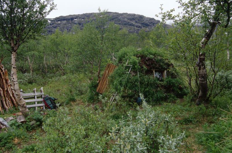 Torvkåta i Rinim mitt i sommarens blomsterprakt. Bilden är tagen i samband med vistelse vid fjällsjön Sijddojávrre.