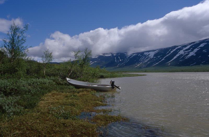 L:25:2000:1:0072 :: sommar, fjällvärld, fjällnatur, världsarvsområde, fjäll, fjällsjö, översvämning, moln, båt, älv, snö