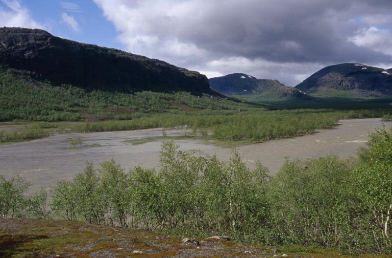 sommar, fjällvärld, fjällnatur, världsarvsområde, fjäll, fjällsjö, översvämning, moln, älv