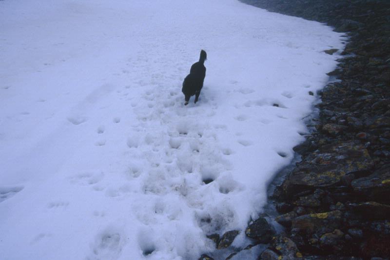 - Det är den 1:a juli och renskötaren har kontakt med renarna igen via spåren. Renspåren leder väster om fjällsjön Dágarjávrre på snösträngar och hunden Kirjo nosar på spåren i snön. Bilden är tagen i samband med arbetet att spåra renarna. Myggen har drivit dom från björkskogen upp mot fjällsjön Dágarjávrre.