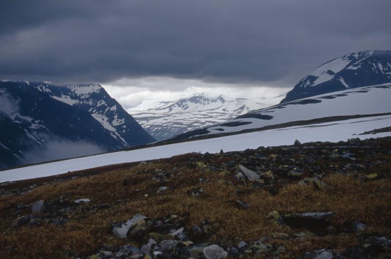 - Fotograferat mot väster vid spaning efter renar i Vássjá. Fjälltoppen Dielmmá i mitten. Det är den 3:e juli, och bilden är tagen i samband med att man försöker samla renarna österut mot dalgången Vássjávágge, inför kalvmärkningen.