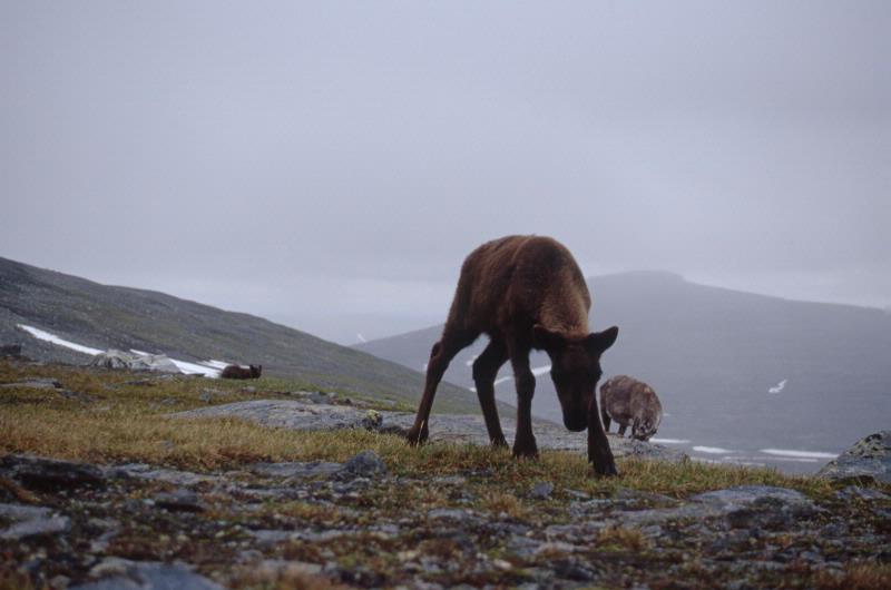 - En omärkt renkalv, ca 5 veckor gammal. Renarna har hämtats ner från Dágarjávrre. Det är den 4:e juli och bilden är tagen i samband med samling av renar inför kalvmärkningen i Aktse Njunjes.