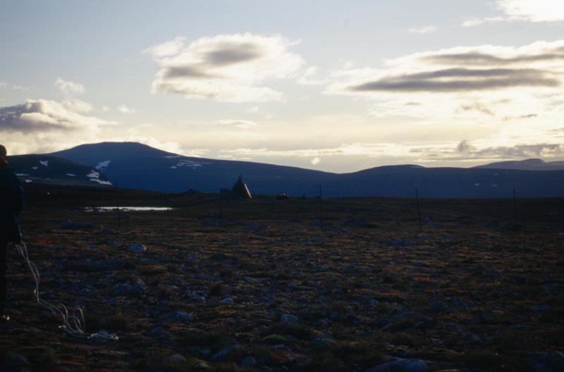 - Bilden visar en tältkåta och en hage, taget på natten. Taget norrut. Det är den 6:e juli och bilden är tagen i samband med kalvmärkning i Aktse Njunjes.