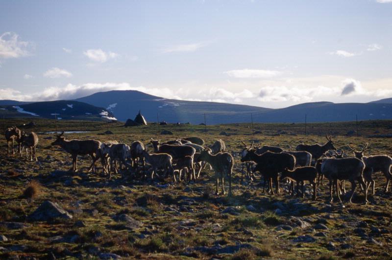 Bilden visar renarna i hagen under en paus. Det är en kall natt, nästan minusgrader. I bakgrunden ser man en tältkåta och snöfläckade fjäll. Det är den 6:e juli och bilden är tagen i samband med kalvmärkning i Aktse Njunjes.