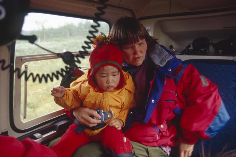 Mor med dotter strax före start av helikoptertransport. På väg till kalvmärkning i Skuollávallda.