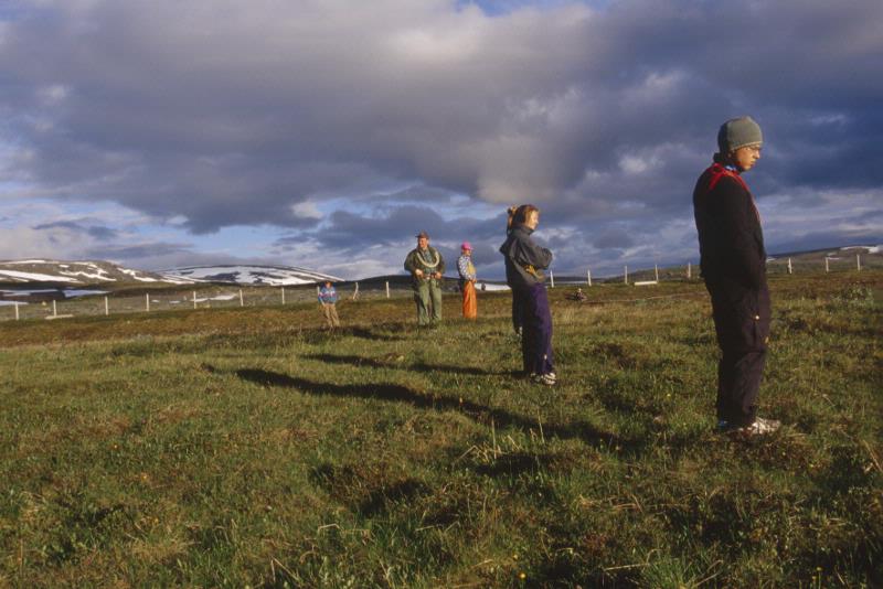 - Ett antal renskötare står på parad. Snöfläckade fjäll i bakgrunden. Bilden är tagen i samband med kalvmärkning i Skuollávallda.