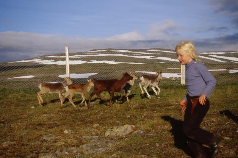 Barn av olika slag. I bakgrunden syns snöfläckar i terrängen. Bilden är tagen i samband med kalvmärkning i Skuollávallda.