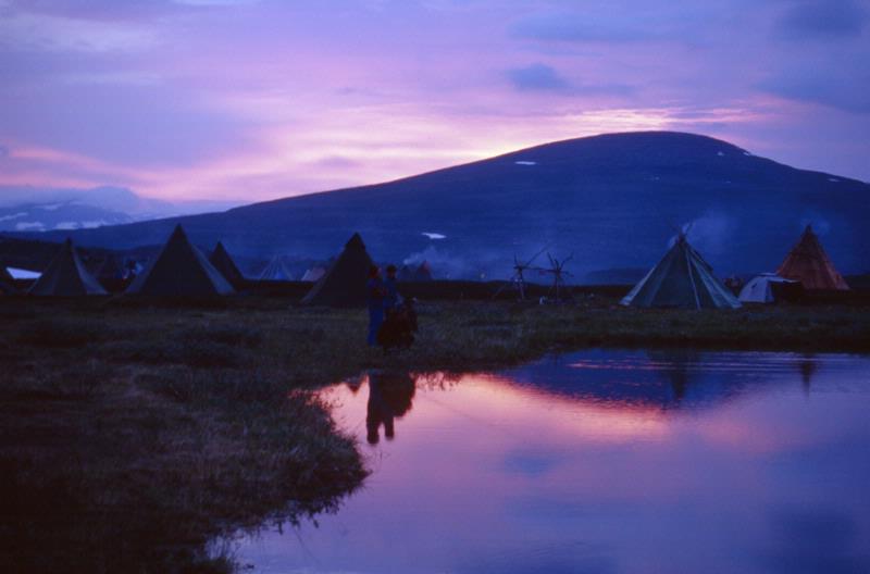 - Idrottsföreningen Sarek IF:s 40 års jubileum. Röken stiger ur tältkåtorna. Snöfläckade fjäll i bakgrunden. Bilden är tagen i samband med kalvmärkning i Skuollávallda.