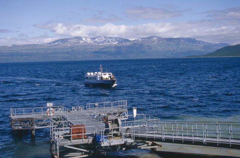 L:25:2000:1:0325 :: sommar, rennäring, fjällvärld, fjällnatur, fjäll, fjällsjö, båt, turistbåt, hamn, snö, brygga