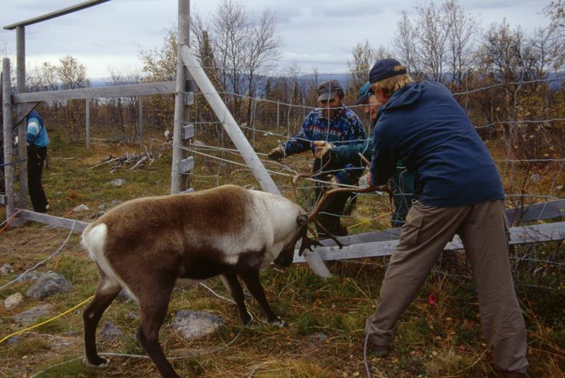 Renskötare från Mellanbyns sameby, och Sörkaitums sameby, drar en sarv in i ett kontor. Bilden är tagen i samband med sarvslakt i Ruokto, Sörkaitum sameby.