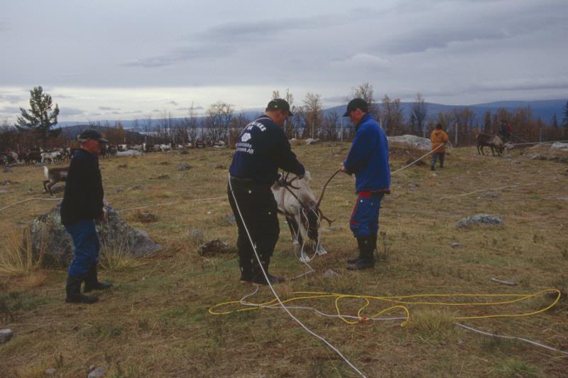 Två renskötare håller i hornen på en ren. Bilden är tagen i samband med sarvslakt i Ruokto, Sörkaitum sameby.