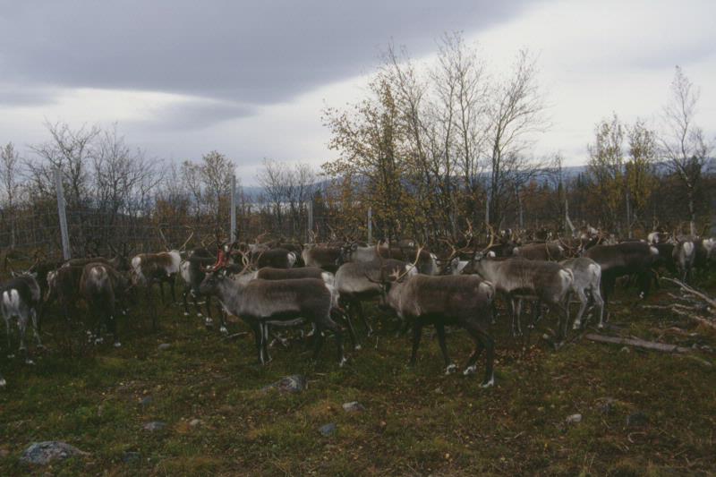 - En skock sarvar, matrenar och kanske renar för avsalu, som skall drivas ner efter kanalen till vägen västerut, till en hage i Ruokto. Bilden är tagen i samband med sarvslakt i Ruokto, Sörkaitum sameby.