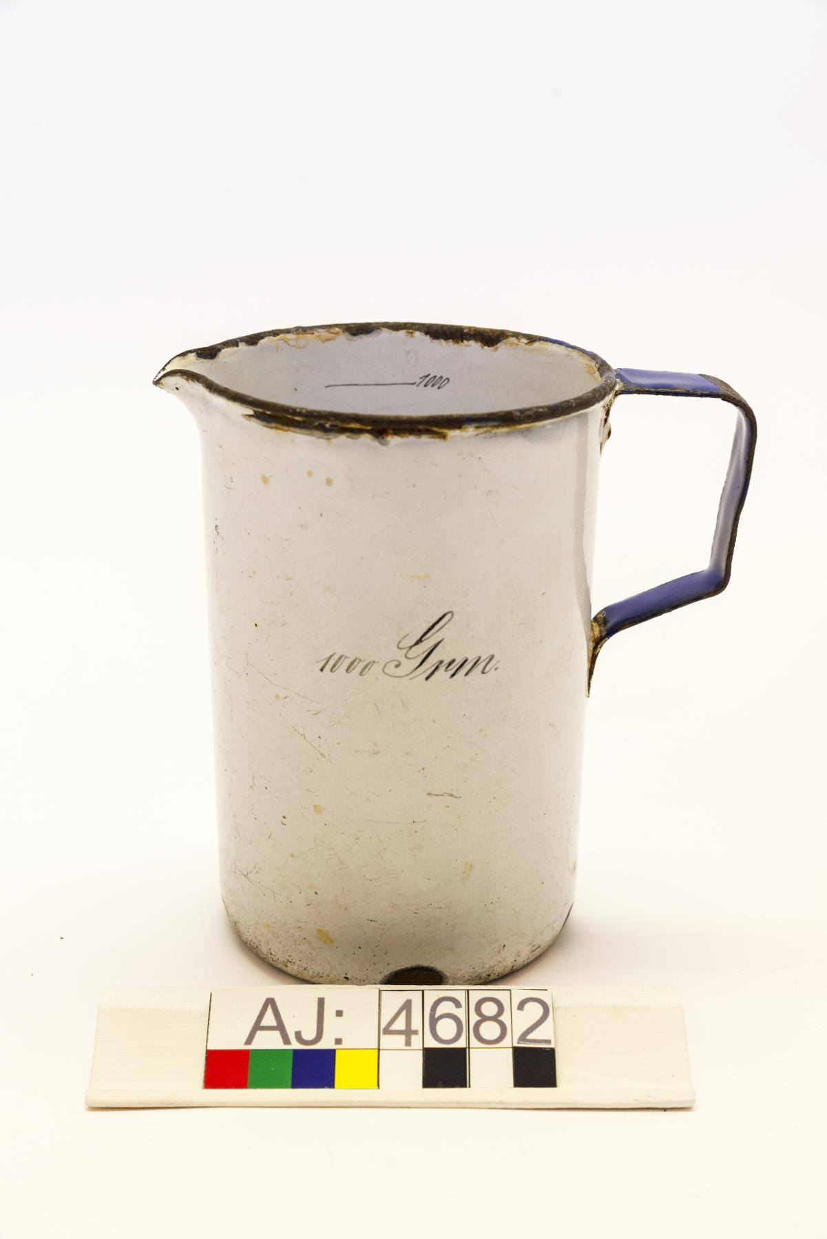 - En vit emaljerad kanna av järn med en blå kant upptill. Kannan har pip och i sidan finns ett blåmålat handtag. Undertill finns en oläslig logotyp. På utsidan av kannan finns texten: 1000 Grm. På insidan finns en måttskala med 8 vågräta sträck. Första måttet är 185 och sista måttet är 1000.