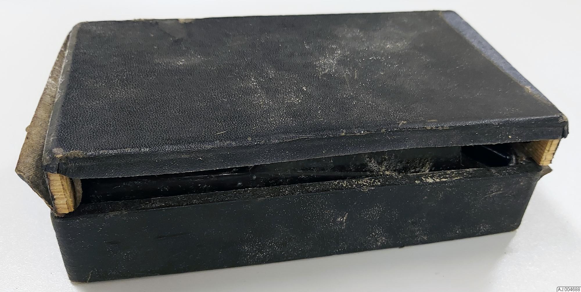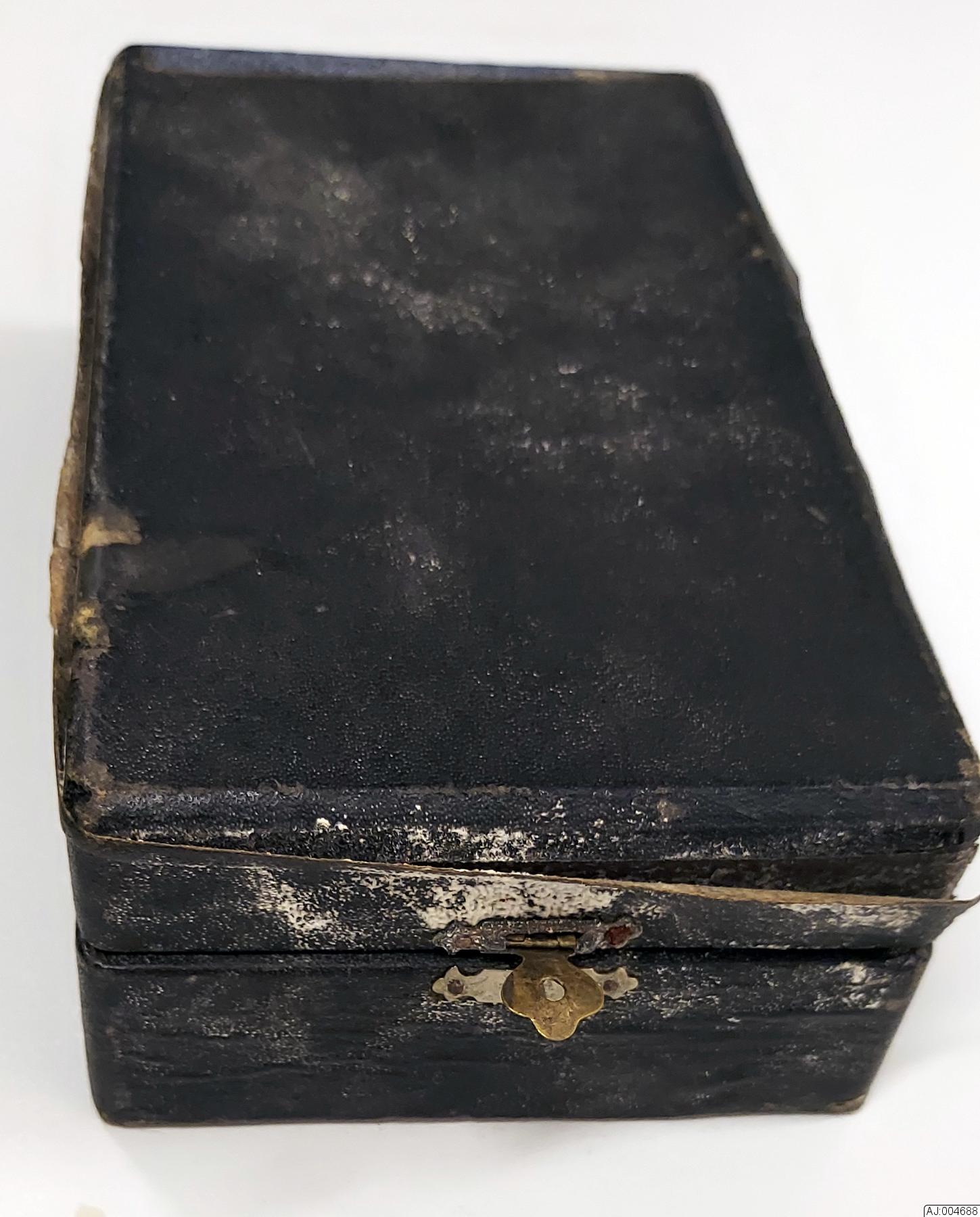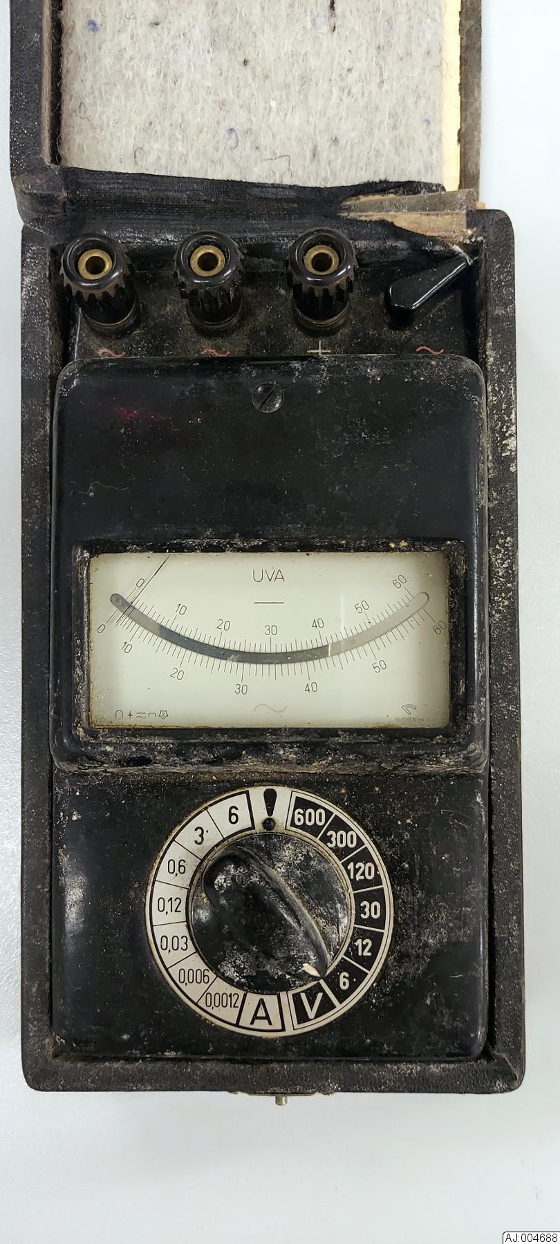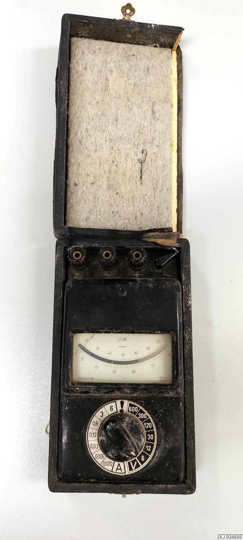 - Volt- amperemätare i en träask med lock. Asken är klädd med svart papp. Locket sitter fast i botten på ena kortsidan. Ena långsidan av locket saknas. Locket är inuti klädd med grå filt och stängs med ett litet spänne. Voltmätaren är av svart bakelit. På voltmätaren finns uttag för tre sladdar. Voltmätaren har en spänningsratt, under ratten finns en platta där man kan läsa av A och V. Ratten går att ställa mot den siffra man önskar. Bakom en glasruta finns själva mätarvisaren.