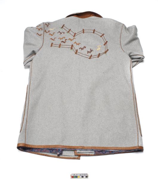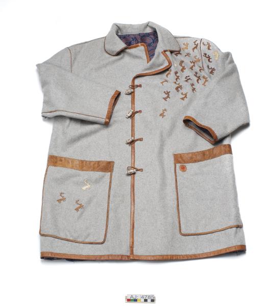 AJ 4785:1 kappa av grå vadmal, fodrad med syntettyg, paisleymönstrat. Kantad med barkgarvat renskinn. Renskinnspasspoaler i sömmarna. Två påsydda fickor av grå vadmal kantade med barkgarvat renskinn. På ena fickan en rund bit skinn, med ett "utklipp och innanför rött kläde. Fyra hornknappar fram, öglor av tvinnat skinn. Kappan har applikationer av skinn på vänster axel fram, ryggen och ena fickan. Apllikationerna är renar som går in i en hage, tre av renarna av vitgarvat skinn, hagen applicerad på ryggen.