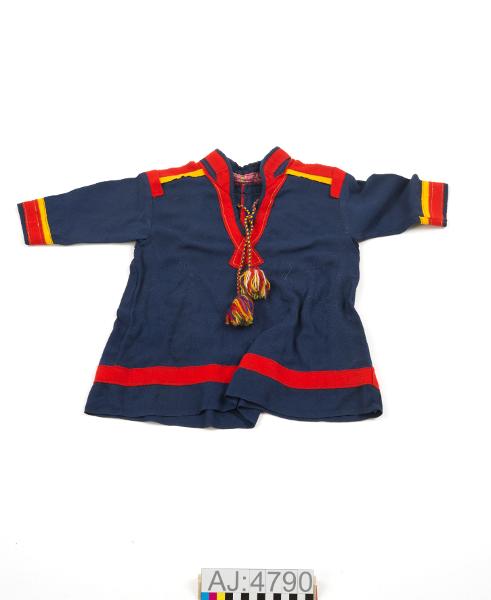 Pojkkolt i Jukkasjärvimodell av blått kypertvävt ylletyg. Klädesdekorationer i rött och gult. Krage och koltens nederkant dekorerad med rött kläde. Krage fodrad med bomullstygi gulgrönt och rosa. Två knytband i halsen av tvinnat ullgarni rött, gult och blått och med tofs.