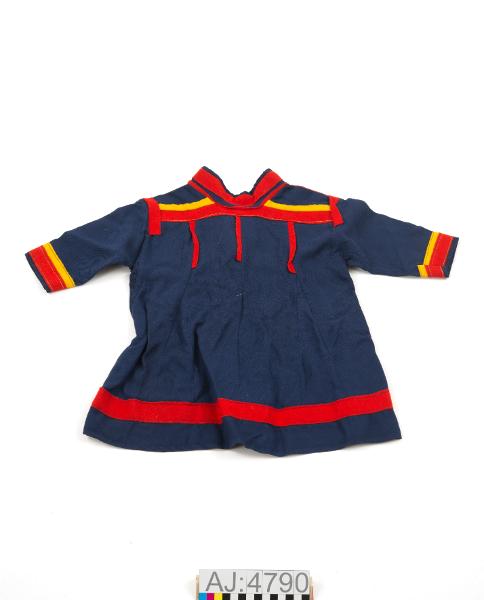 - Pojkkolt i Jukkasjärvimodell av blått kypertvävt ylletyg. Klädesdekorationer i rött och gult. Krage och koltens nederkant dekorerad med rött kläde. Krage fodrad med bomullstygi gulgrönt och rosa. Två knytband i halsen av tvinnat ullgarni rött, gult och blått och med tofs.