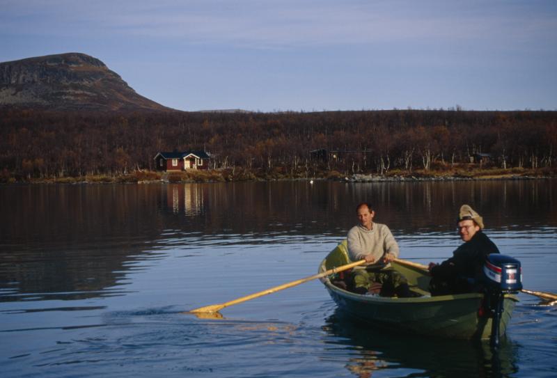 L:25:2000:2:0076 :: båt, fjällnatur, fjällsjö, fjällvärld, höst, roddbåt, stuga, världsarvsområde, fjäll, turiststuga