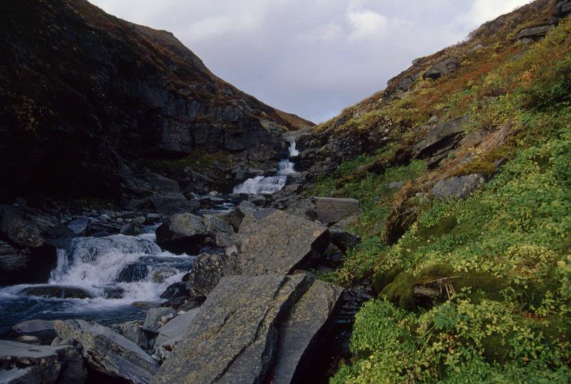 Ravin ovanför björkskogen i Alep Vássjájågåsj. Här finns det ännu gröna växter i slutet av september.