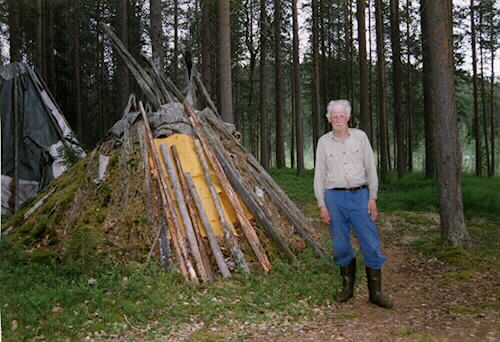 näverkåta, kåtastång, dörröppning, näver, man, byggnadsarbetare